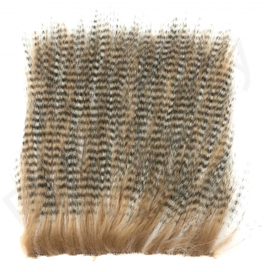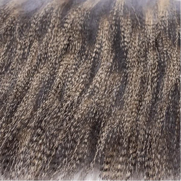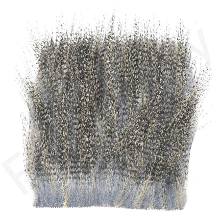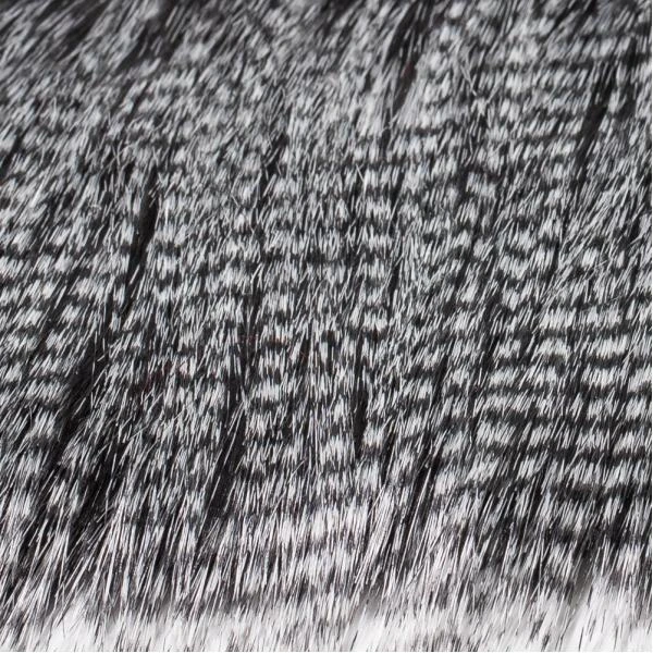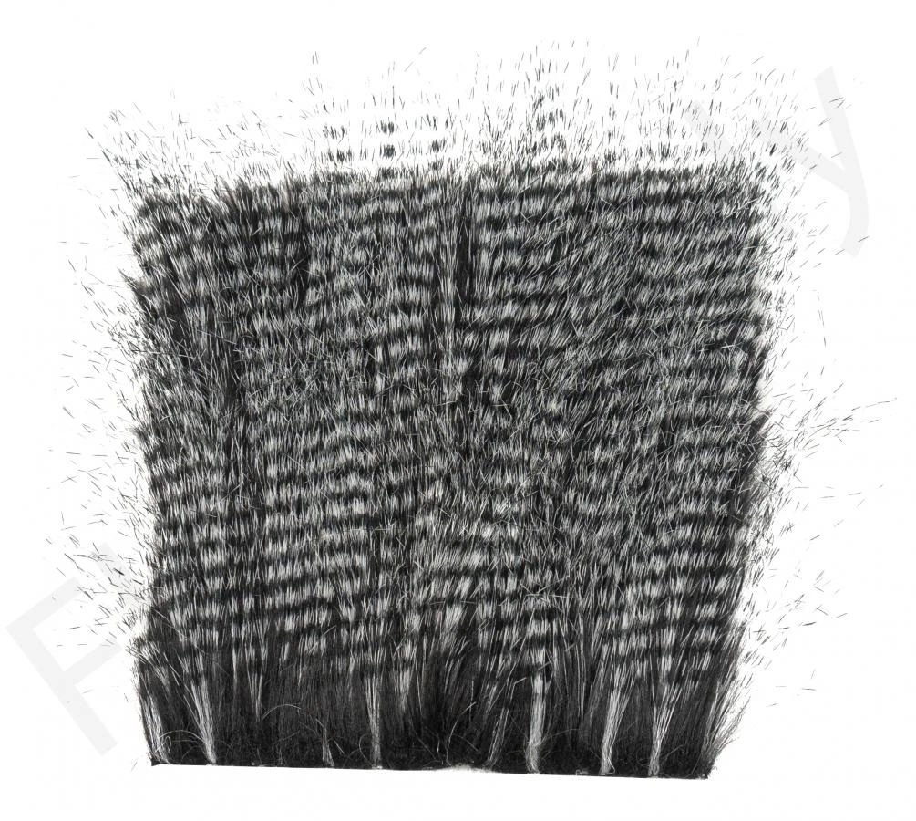 Black barred synthetic hair with underfur on a 12 x 13 cm woven carpet.