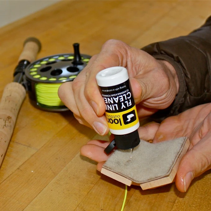 A cleaner line means a better cast and more fish. The Loon Line Cleaning Tool features a sheepskin pad and two hardwood blocks hinged together to create the perfect vessel for applying a line cleaner like Line Speed, Streamline or Scandinavian Line Cleaner.