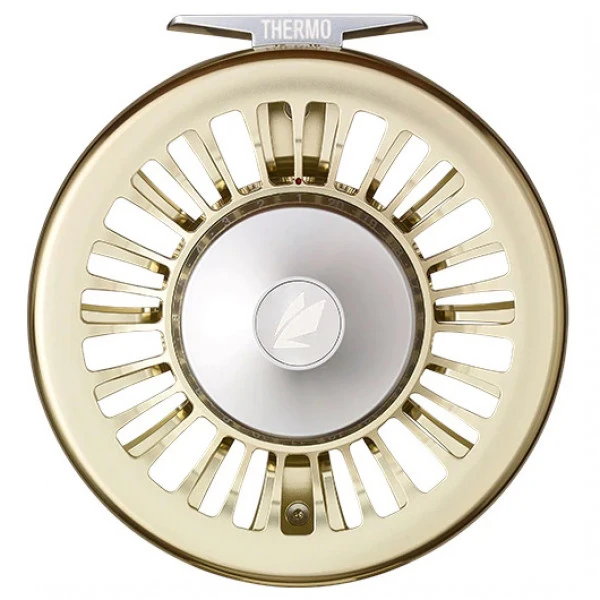 Starting with a new ultra-robust SCS drag package specifically built and tuned for the extreme, the Sage Thermo Champagne Fly Reel delivers 0 to 20 lbs of drag with unparalleled consistency of drag pressure throughout the entire run of the fish. No drop-off, skipping, or wear out because of overheating, the Thermo handles the extremes with ease, as the drag efficiently dissipates the heat across its fully sealed extra-large carbon brake discs. Twenty easy-to-see drag settings sit atop a large-diameter drag knob that is incredibly easy to grip and adjust in the heat of a battle, while 39 detents allow for fine tuning adjustments for any leader and tippet combination. The extra sturdy frame and spool are designed to hold up to the rigors of boat fishing, where a knock on the gunwale or pounding run through breakers is not unusual. With a hefty large diameter ergonomic handle for maximum grip and control, and large arbour spool for quick pick up and 500+ yards backing capacity, the Sage Thermo Champagne Fly Reel is the ultimate powerhouse of big game fishing reels.