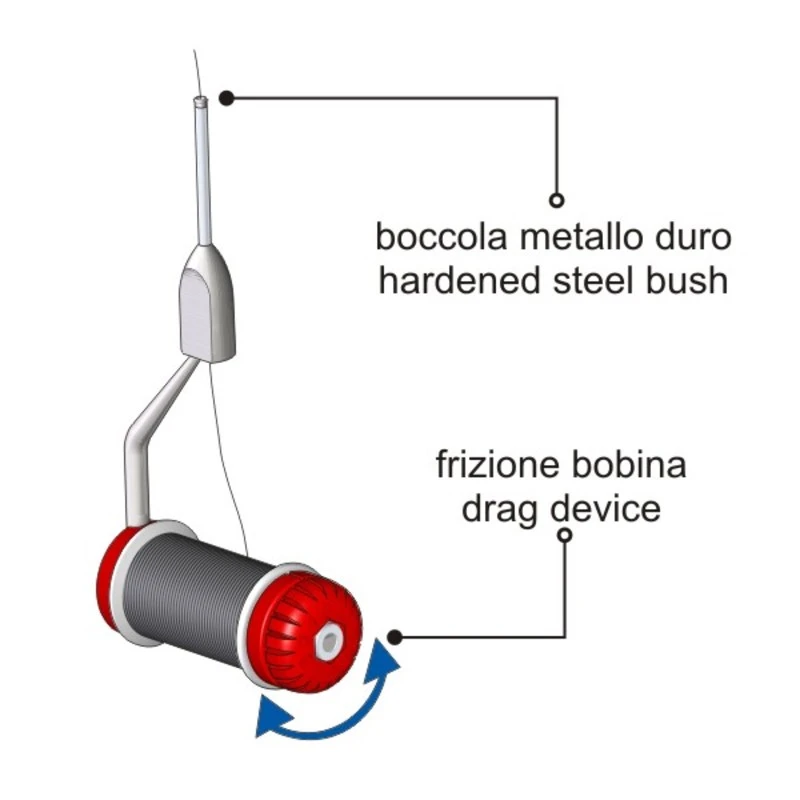 A top quality weighted stainless steel bobbin with quick adjusting disc-drag that allows a perfect thread tension. Tube with very strong hardened steel bush to prevent fraying.