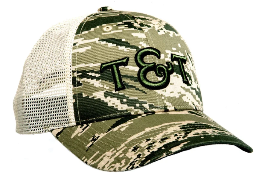 A great new addition to the range, a stealth camouflage Trucker with embroidered T&T logo.Â