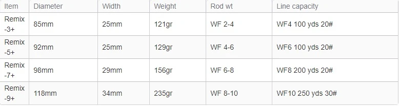 | Item | Diameter | Width | Weight | Rod wt | Line capacity |
